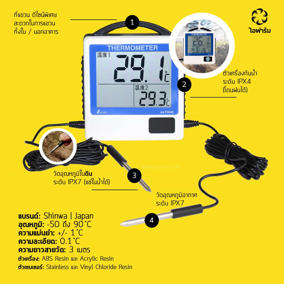 แบรนด์ Shinwa ของแท้จากญี่ปุ่น โดดเด่นด้วยฟังก์ชั่นการทำงานที่ช่วยให้คุณวัดอุณหภูมิดินและอากาศได้พร้อมกันในเครื่องเดียว ที่สำคัญตัวเครื่องกันน้ำ (Water Proof) ระดับมาตรฐาน IPX4 (กันฝนได้) / โพรบวัด ระดับมาตรฐาน IPX7 (แช่น้ำได้) ที่แขวนดีไซน์ให้สะดวกในการแขวนทั้งในและนอกอาคาร (โรงเรือน) แข็งแรง ทนทาน เหมาะสำหรับใช้งานใน Green House / โรงเรือน / ห้องปฏิบัติการ วัดค่าได้อย่างแม่นยำตามมาตรฐานแบรนด์จากญี่ปุ่น
