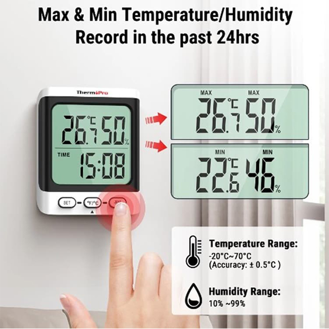 เครื่องวัดอุณหภูมิและความชื้นอากาศ Digital (Indoor Temperature & Humidity Monitor) ขนาด Compact ดีไซน์ทันสมัย เรียบหรู Finishing เนี้ยบ ด้วยช่วงวัดที่กว้าง (ทั้งอุณหภูมิและความชื้น) ตอบโจทย์การใช้งานที่หลากหลาย คุณภาพผ่านมาตรฐาน CE ของยุโรป ความคลาดเคลื่อนต่ำ มั่นใจเรื่องความแม่นยำ หน้าจอใหญ่กว่ารุ่นทั่วไปในขนาดเดียวกัน ตัวเลขคมชัด อ่านค่าได้ชัดเจนทุกมุมมอง มาพร้อมกับฟีเจอร์อื่นๆ ที่ทำให้การใช้งานเต็มประสิทธิภาพมากยิ่งขึ้น อาทิ Min-Max Record, Clock และการติดตั้ง 3 รูปแบบ